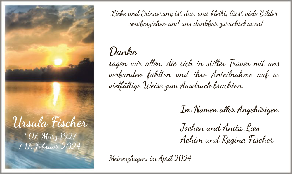 Hier finden Sie alle Traueranzeigen aus der Zeitung, die bisher für Ursula Fischer erschienen sind. Weitere Traueranzeigen, die in der Zeitung erscheinen, werden hier ebenfalls aufgelistet