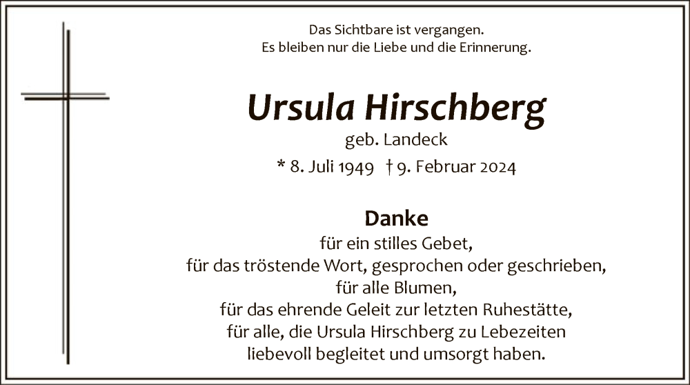Hier finden Sie alle Traueranzeigen aus der Zeitung, die bisher für Ursula Hirschberg erschienen sind. Weitere Traueranzeigen, die in der Zeitung erscheinen, werden hier ebenfalls aufgelistet