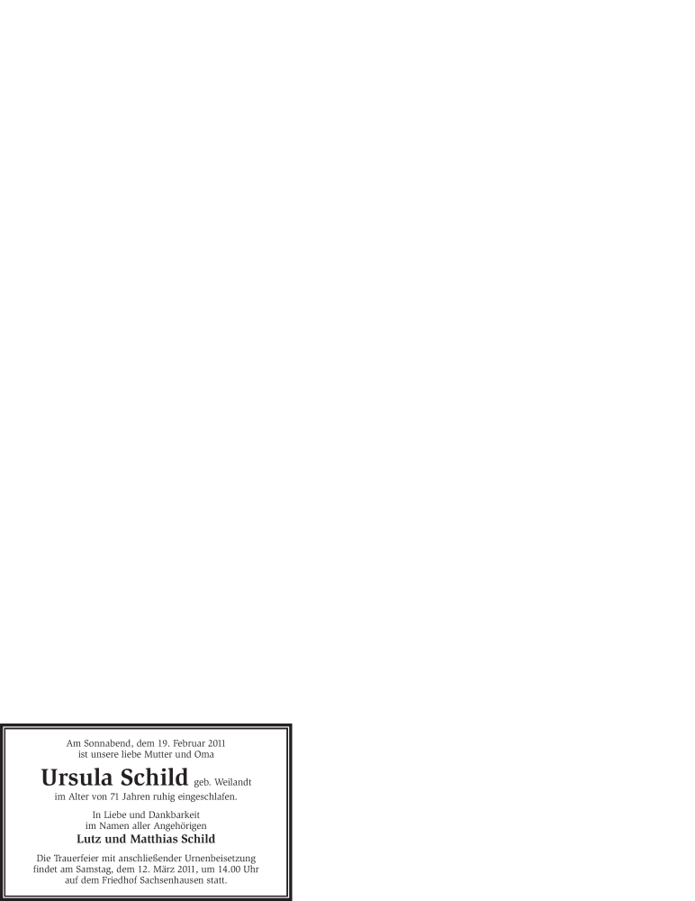 Hier finden Sie alle Traueranzeigen aus der Zeitung, die bisher für Ursula Schild erschienen sind. Weitere Traueranzeigen, die in der Zeitung erscheinen, werden hier ebenfalls aufgelistet