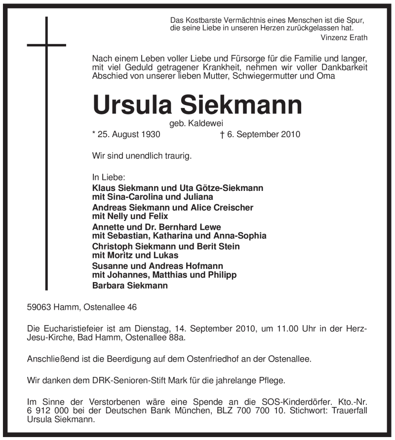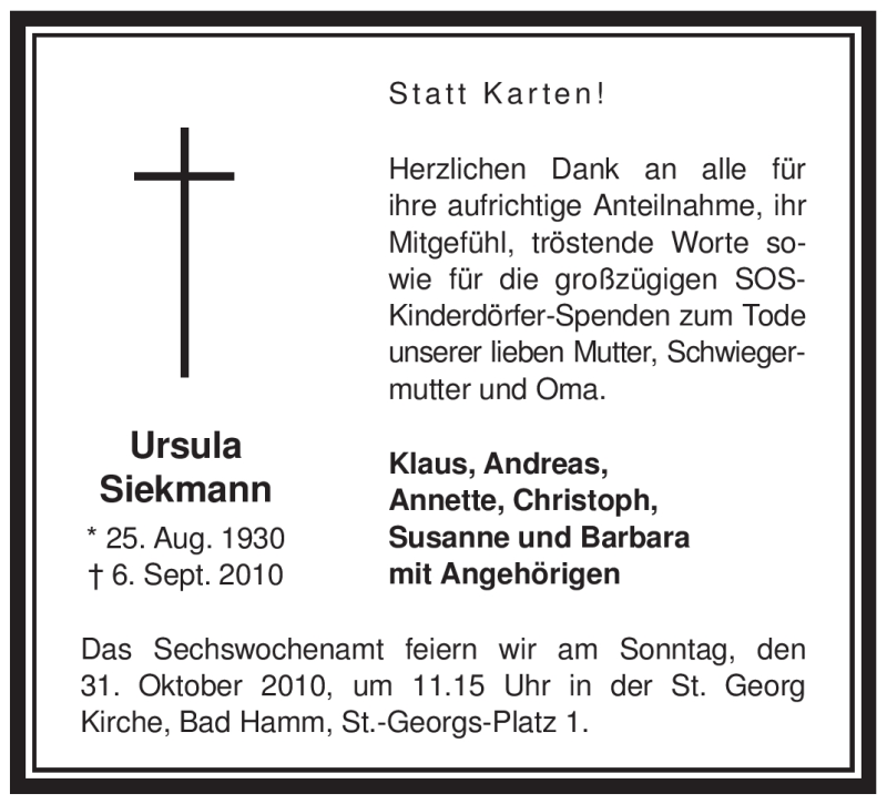 Hier finden Sie alle Traueranzeigen aus der Zeitung, die bisher für Ursula Siekmann erschienen sind. Weitere Traueranzeigen, die in der Zeitung erscheinen, werden hier ebenfalls aufgelistet
