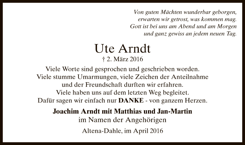Hier finden Sie alle Traueranzeigen aus der Zeitung, die bisher für Ute Arndt erschienen sind. Weitere Traueranzeigen, die in der Zeitung erscheinen, werden hier ebenfalls aufgelistet