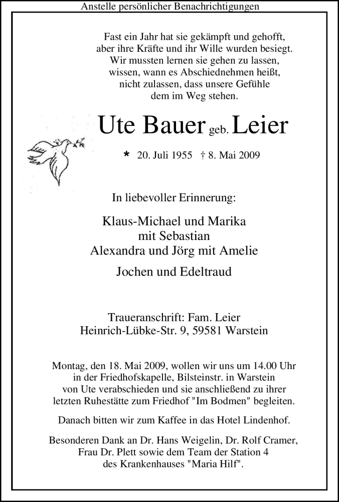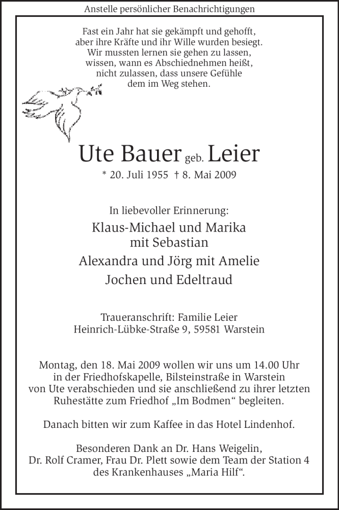 Hier finden Sie alle Traueranzeigen aus der Zeitung, die bisher für Ute Bauer erschienen sind. Weitere Traueranzeigen, die in der Zeitung erscheinen, werden hier ebenfalls aufgelistet