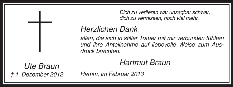Hier finden Sie alle Traueranzeigen aus der Zeitung, die bisher für Ute Braun erschienen sind. Weitere Traueranzeigen, die in der Zeitung erscheinen, werden hier ebenfalls aufgelistet