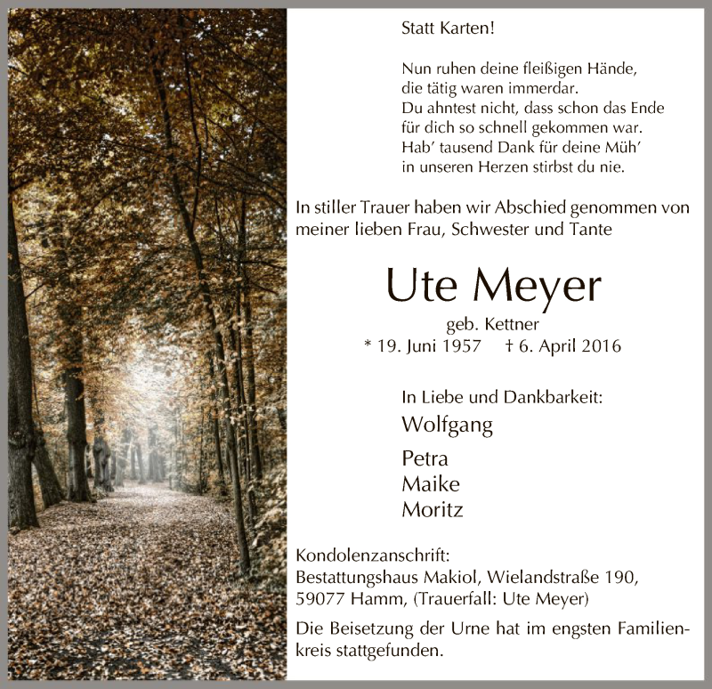 Hier finden Sie alle Traueranzeigen aus der Zeitung, die bisher für Ute Meyer erschienen sind. Weitere Traueranzeigen, die in der Zeitung erscheinen, werden hier ebenfalls aufgelistet