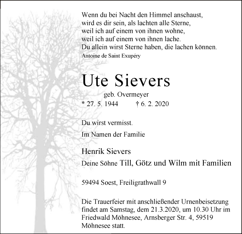Hier finden Sie alle Traueranzeigen aus der Zeitung, die bisher für Ute Sievers erschienen sind. Weitere Traueranzeigen, die in der Zeitung erscheinen, werden hier ebenfalls aufgelistet