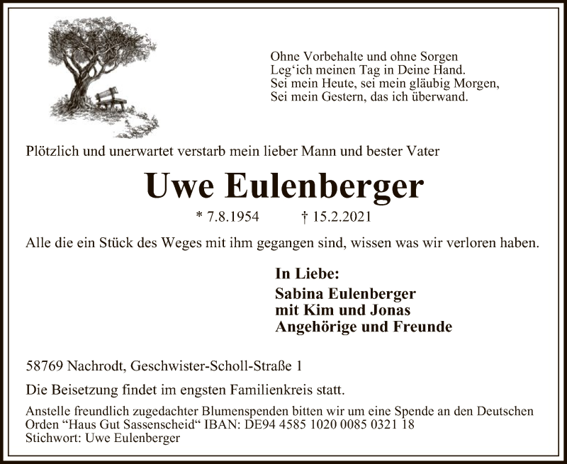 Hier finden Sie alle Traueranzeigen aus der Zeitung, die bisher für Uwe Eulenberger erschienen sind. Weitere Traueranzeigen, die in der Zeitung erscheinen, werden hier ebenfalls aufgelistet