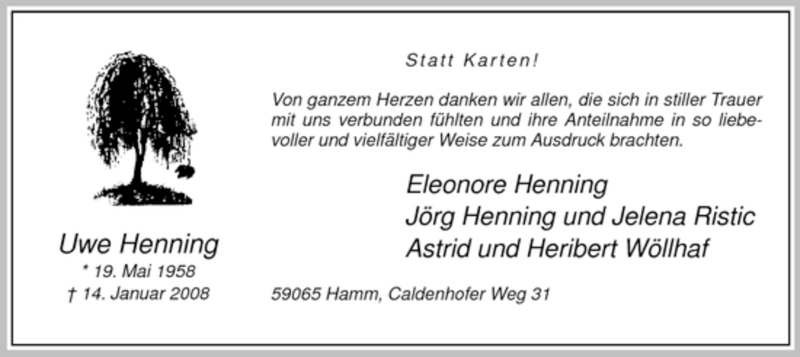 Hier finden Sie alle Traueranzeigen aus der Zeitung, die bisher für Uwe Henning erschienen sind. Weitere Traueranzeigen, die in der Zeitung erscheinen, werden hier ebenfalls aufgelistet