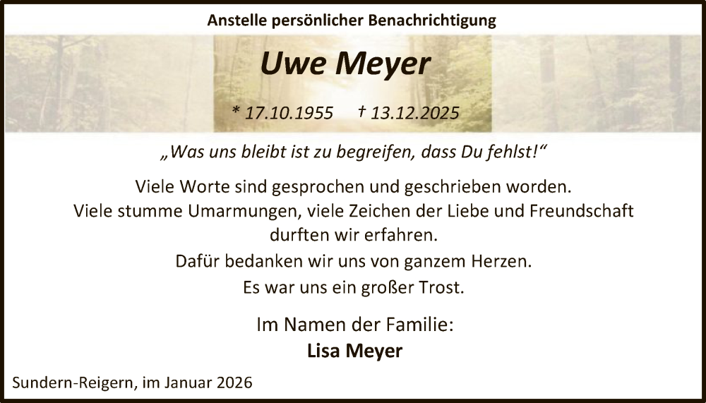 Hier finden Sie alle Traueranzeigen aus der Zeitung, die bisher für Uwe Meyer erschienen sind. Weitere Traueranzeigen, die in der Zeitung erscheinen, werden hier ebenfalls aufgelistet