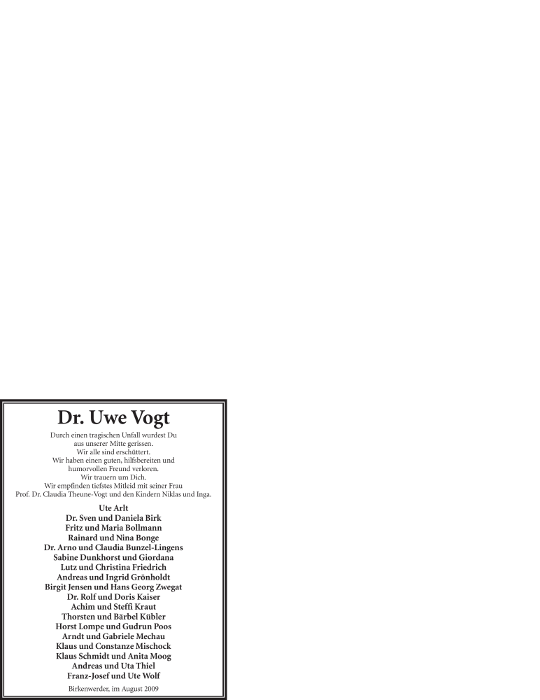 Hier finden Sie alle Traueranzeigen aus der Zeitung, die bisher für Uwe Vogt erschienen sind. Weitere Traueranzeigen, die in der Zeitung erscheinen, werden hier ebenfalls aufgelistet