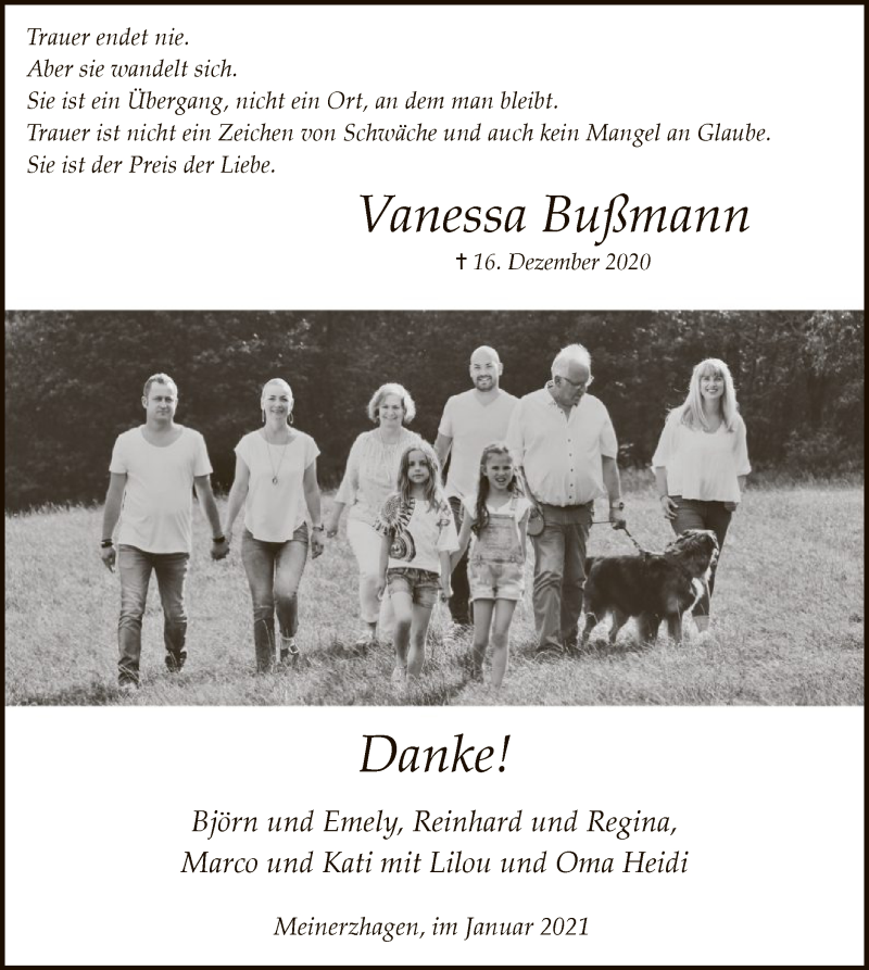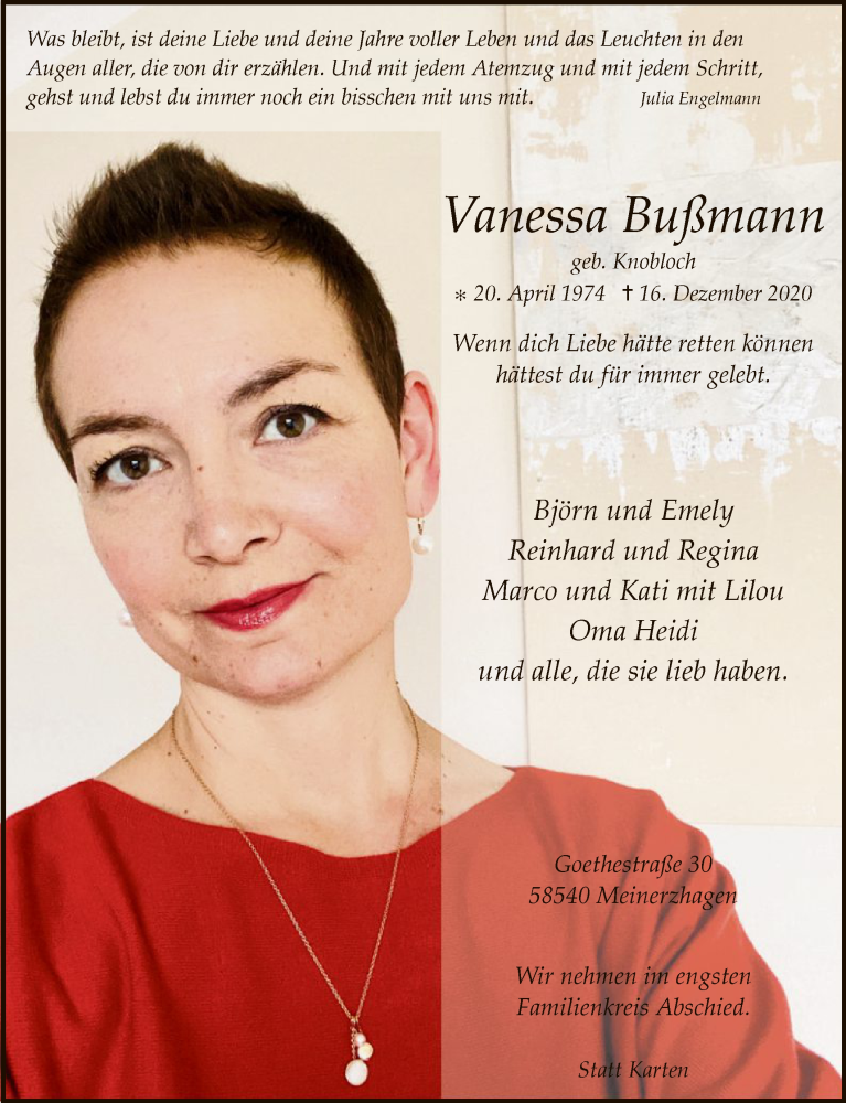 Hier finden Sie alle Traueranzeigen aus der Zeitung, die bisher für Vanessa Bußmann erschienen sind. Weitere Traueranzeigen, die in der Zeitung erscheinen, werden hier ebenfalls aufgelistet