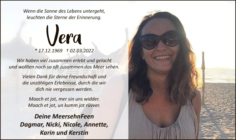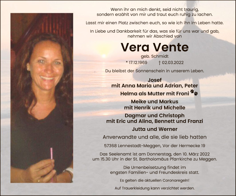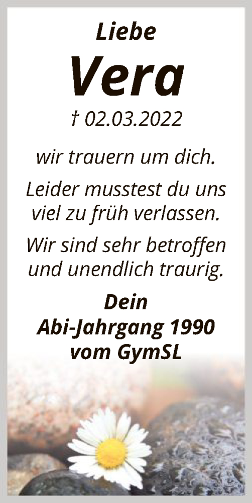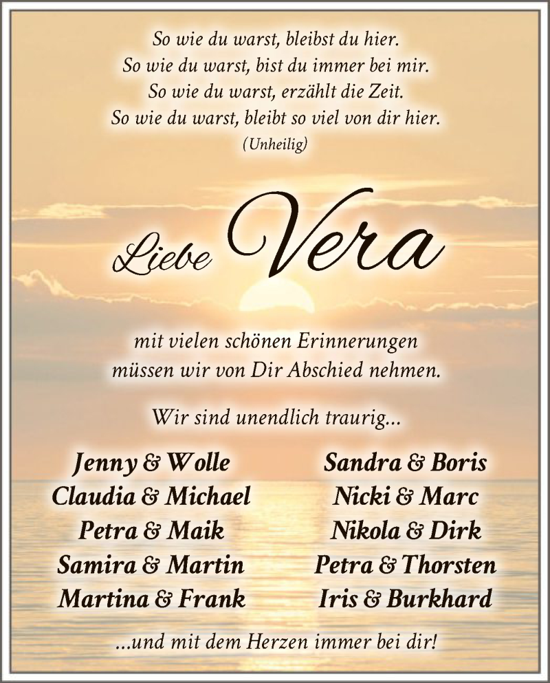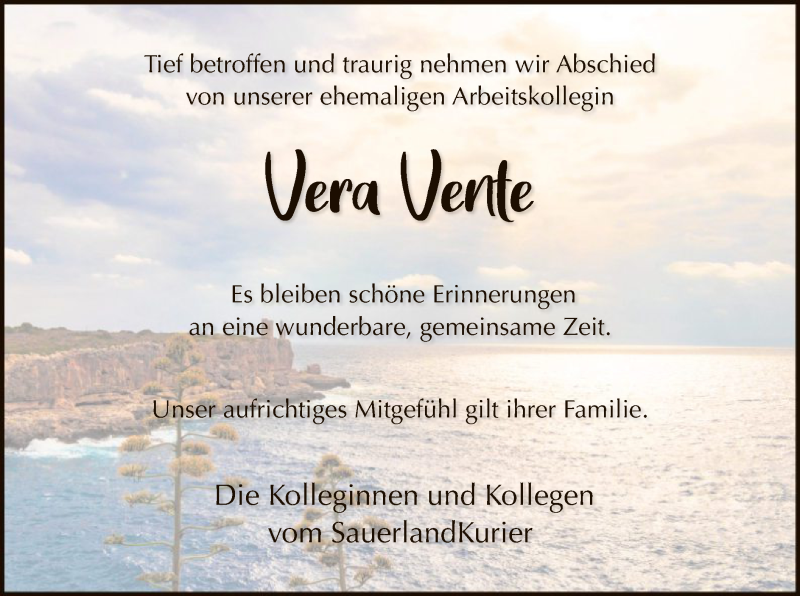 Hier finden Sie alle Traueranzeigen aus der Zeitung, die bisher für Vera Vente erschienen sind. Weitere Traueranzeigen, die in der Zeitung erscheinen, werden hier ebenfalls aufgelistet
