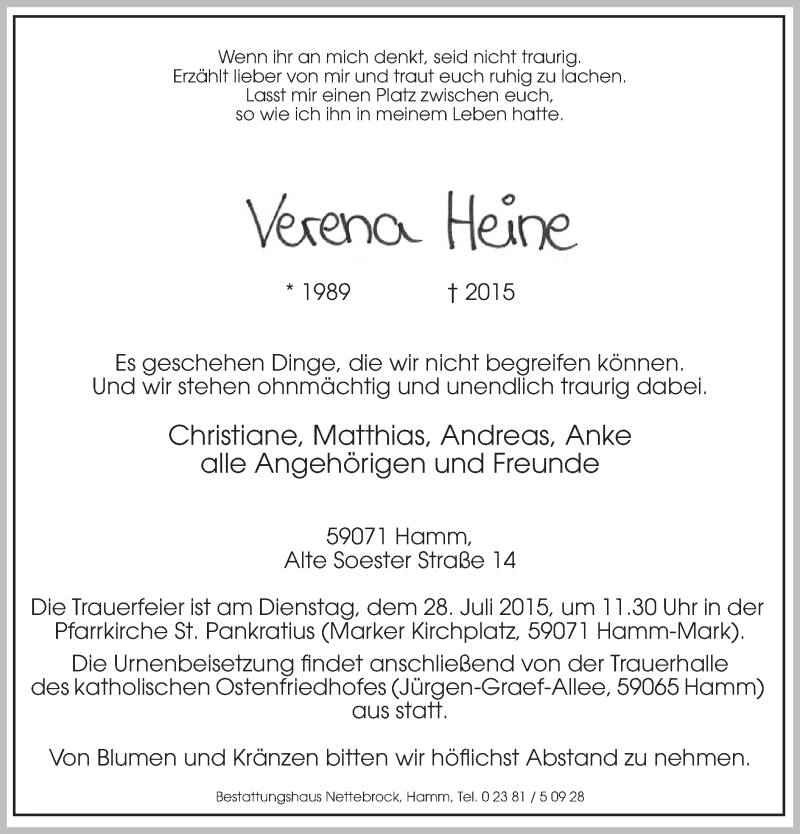Hier finden Sie alle Traueranzeigen aus der Zeitung, die bisher für Verena Heine erschienen sind. Weitere Traueranzeigen, die in der Zeitung erscheinen, werden hier ebenfalls aufgelistet