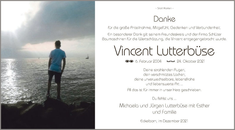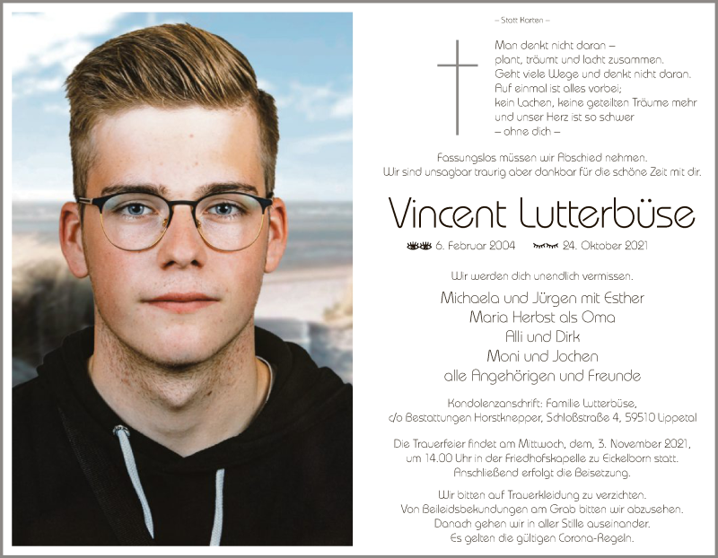 Hier finden Sie alle Traueranzeigen aus der Zeitung, die bisher für Vincent Lutterbüse erschienen sind. Weitere Traueranzeigen, die in der Zeitung erscheinen, werden hier ebenfalls aufgelistet
