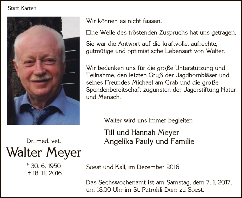 Hier finden Sie alle Traueranzeigen aus der Zeitung, die bisher für Walter Meyer erschienen sind. Weitere Traueranzeigen, die in der Zeitung erscheinen, werden hier ebenfalls aufgelistet