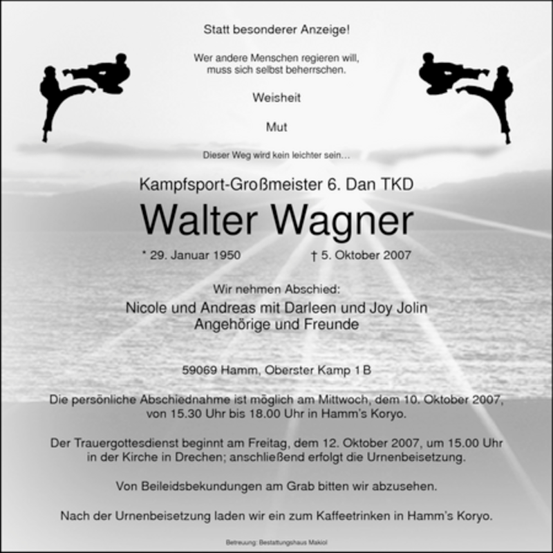 Hier finden Sie alle Traueranzeigen aus der Zeitung, die bisher für Walter Wagner erschienen sind. Weitere Traueranzeigen, die in der Zeitung erscheinen, werden hier ebenfalls aufgelistet