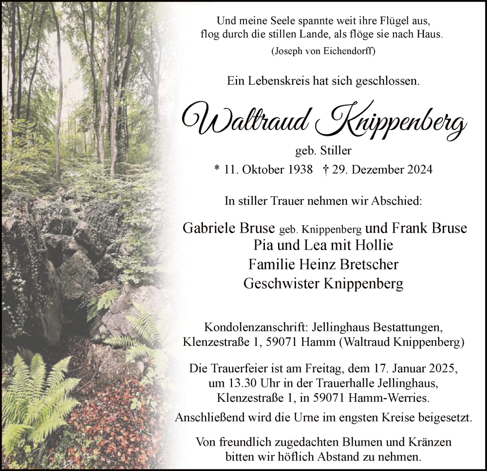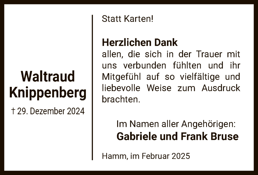 Hier finden Sie alle Traueranzeigen aus der Zeitung, die bisher für Waltraud Knippenberg erschienen sind. Weitere Traueranzeigen, die in der Zeitung erscheinen, werden hier ebenfalls aufgelistet