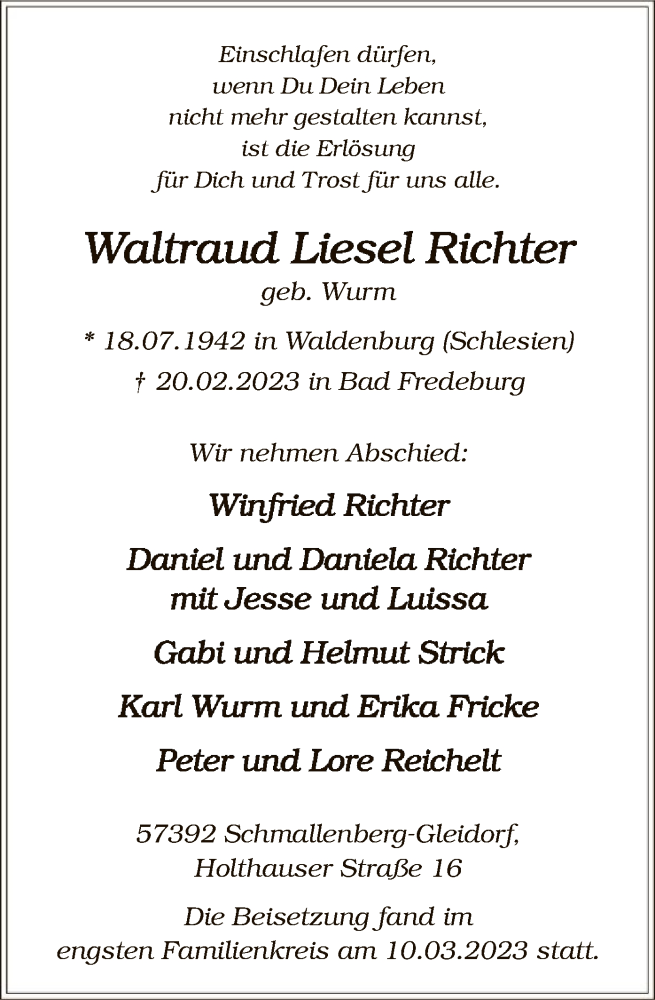 Hier finden Sie alle Traueranzeigen aus der Zeitung, die bisher für Waltraud Liesel Richter erschienen sind. Weitere Traueranzeigen, die in der Zeitung erscheinen, werden hier ebenfalls aufgelistet