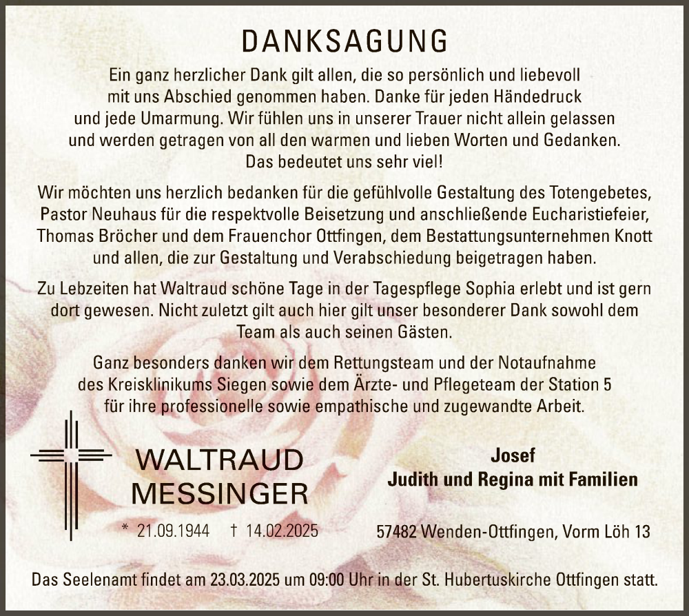 Hier finden Sie alle Traueranzeigen aus der Zeitung, die bisher für Waltraud Messinger erschienen sind. Weitere Traueranzeigen, die in der Zeitung erscheinen, werden hier ebenfalls aufgelistet