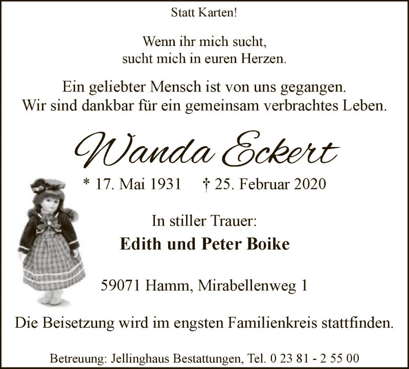 Hier finden Sie alle Traueranzeigen aus der Zeitung, die bisher für Wanda Eckert erschienen sind. Weitere Traueranzeigen, die in der Zeitung erscheinen, werden hier ebenfalls aufgelistet