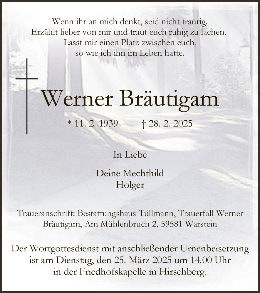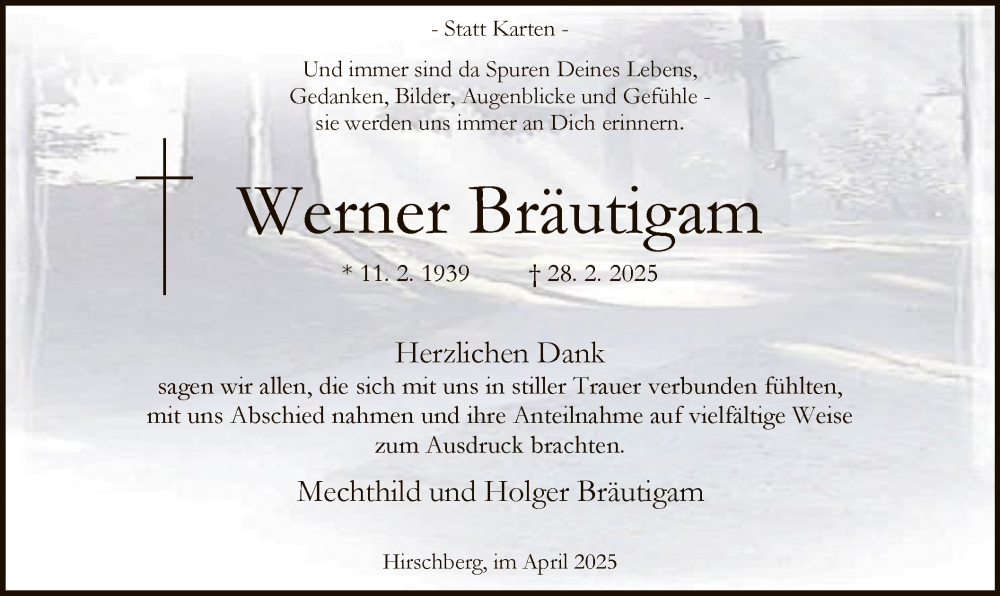 Hier finden Sie alle Traueranzeigen aus der Zeitung, die bisher für Werner Bräutigam erschienen sind. Weitere Traueranzeigen, die in der Zeitung erscheinen, werden hier ebenfalls aufgelistet