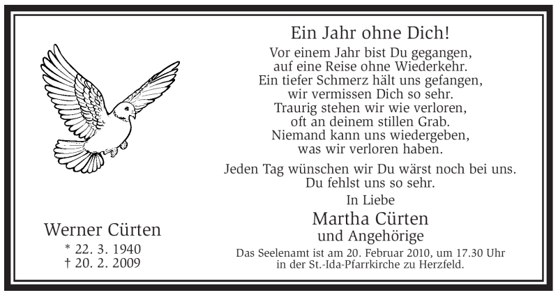 Hier finden Sie alle Traueranzeigen aus der Zeitung, die bisher für Werner Cürten erschienen sind. Weitere Traueranzeigen, die in der Zeitung erscheinen, werden hier ebenfalls aufgelistet