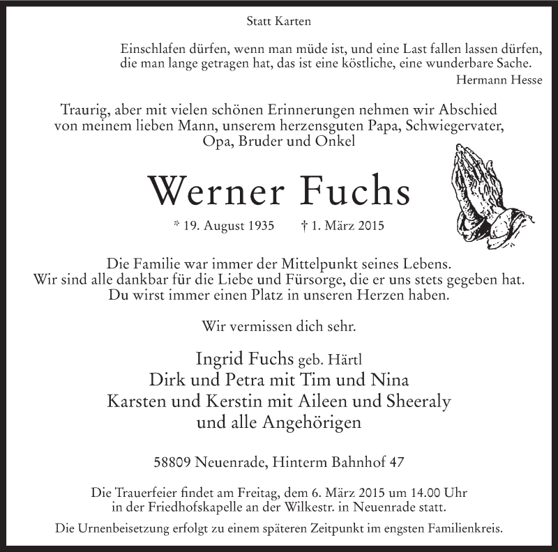 Hier finden Sie alle Traueranzeigen aus der Zeitung, die bisher für Werner Fuchs erschienen sind. Weitere Traueranzeigen, die in der Zeitung erscheinen, werden hier ebenfalls aufgelistet