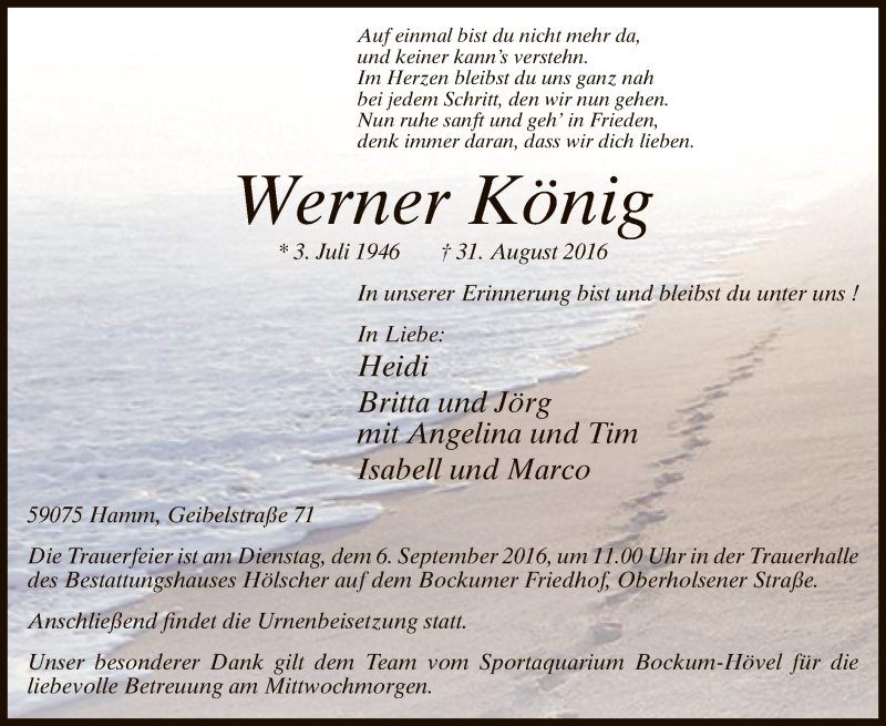 Hier finden Sie alle Traueranzeigen aus der Zeitung, die bisher für Werner König erschienen sind. Weitere Traueranzeigen, die in der Zeitung erscheinen, werden hier ebenfalls aufgelistet