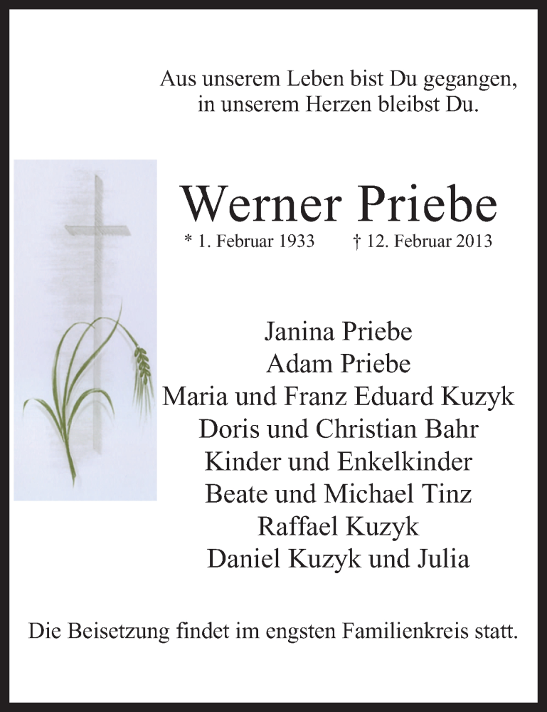 Hier finden Sie alle Traueranzeigen aus der Zeitung, die bisher für Werner Priebe erschienen sind. Weitere Traueranzeigen, die in der Zeitung erscheinen, werden hier ebenfalls aufgelistet