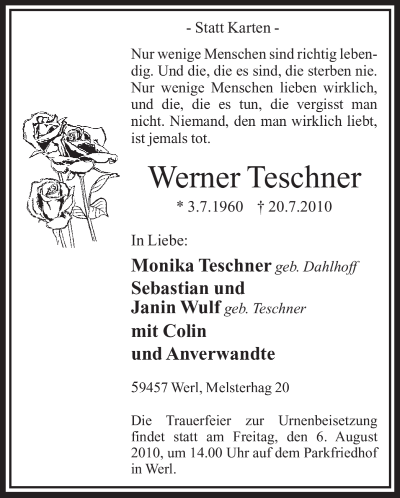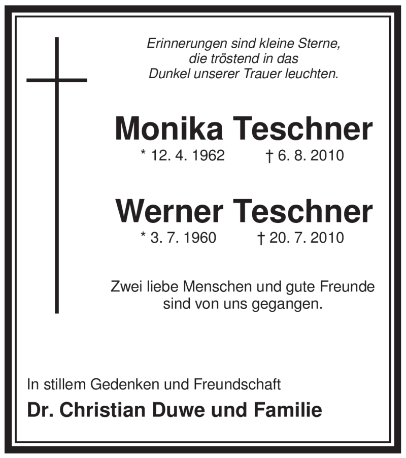 Hier finden Sie alle Traueranzeigen aus der Zeitung, die bisher für Werner Teschner erschienen sind. Weitere Traueranzeigen, die in der Zeitung erscheinen, werden hier ebenfalls aufgelistet