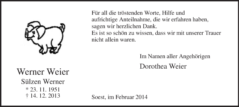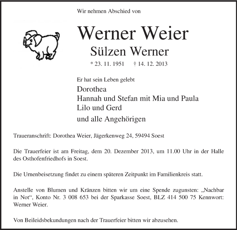 Hier finden Sie alle Traueranzeigen aus der Zeitung, die bisher für Werner Weier erschienen sind. Weitere Traueranzeigen, die in der Zeitung erscheinen, werden hier ebenfalls aufgelistet