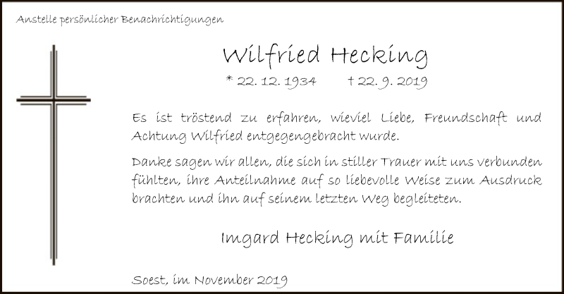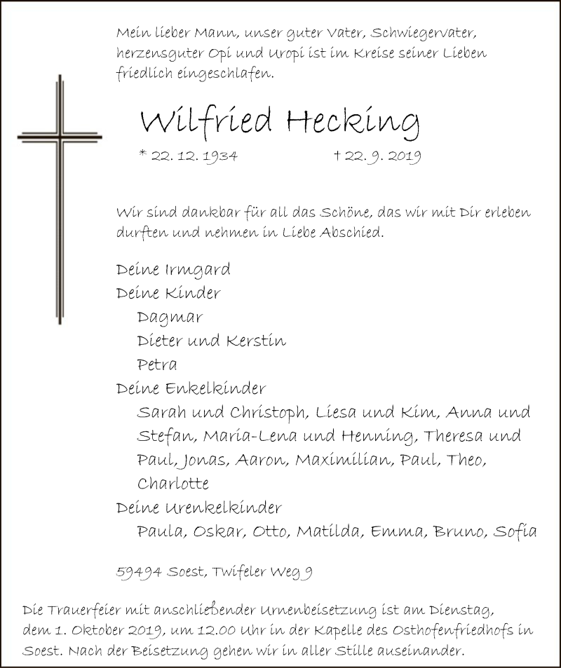 Hier finden Sie alle Traueranzeigen aus der Zeitung, die bisher für Wilfried Hecking erschienen sind. Weitere Traueranzeigen, die in der Zeitung erscheinen, werden hier ebenfalls aufgelistet