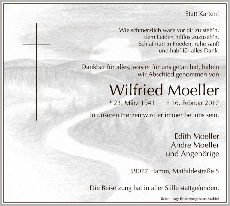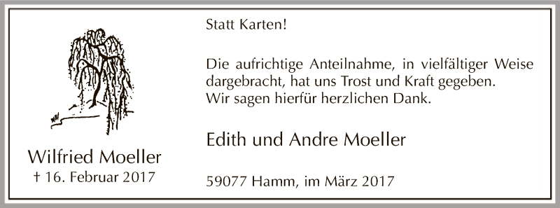 Hier finden Sie alle Traueranzeigen aus der Zeitung, die bisher für Wilfried Moeller erschienen sind. Weitere Traueranzeigen, die in der Zeitung erscheinen, werden hier ebenfalls aufgelistet