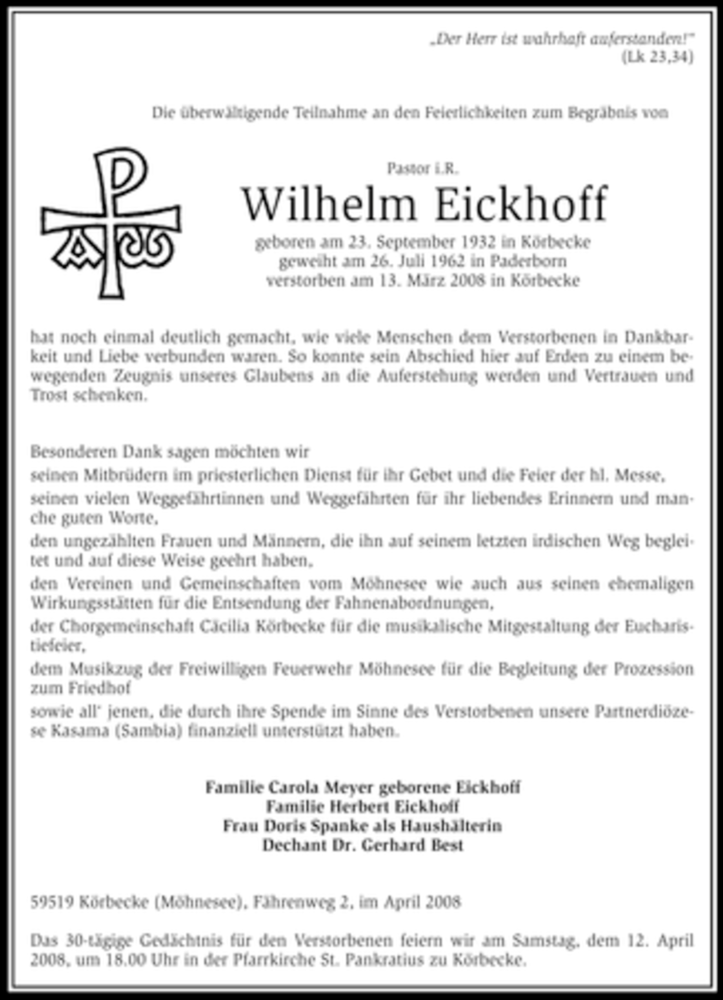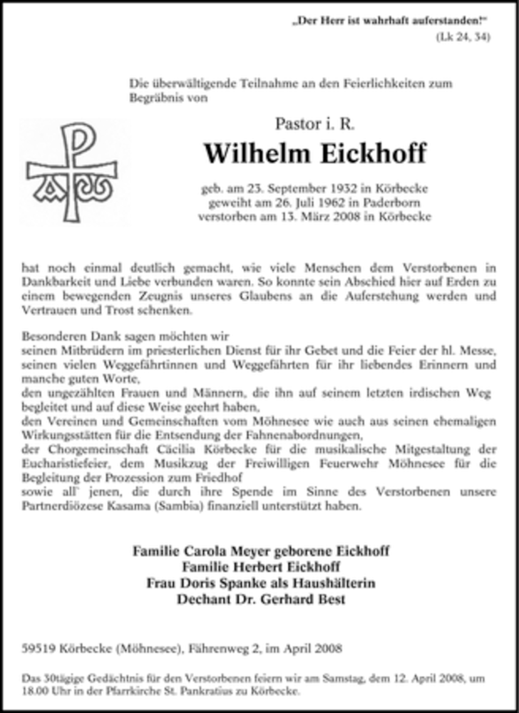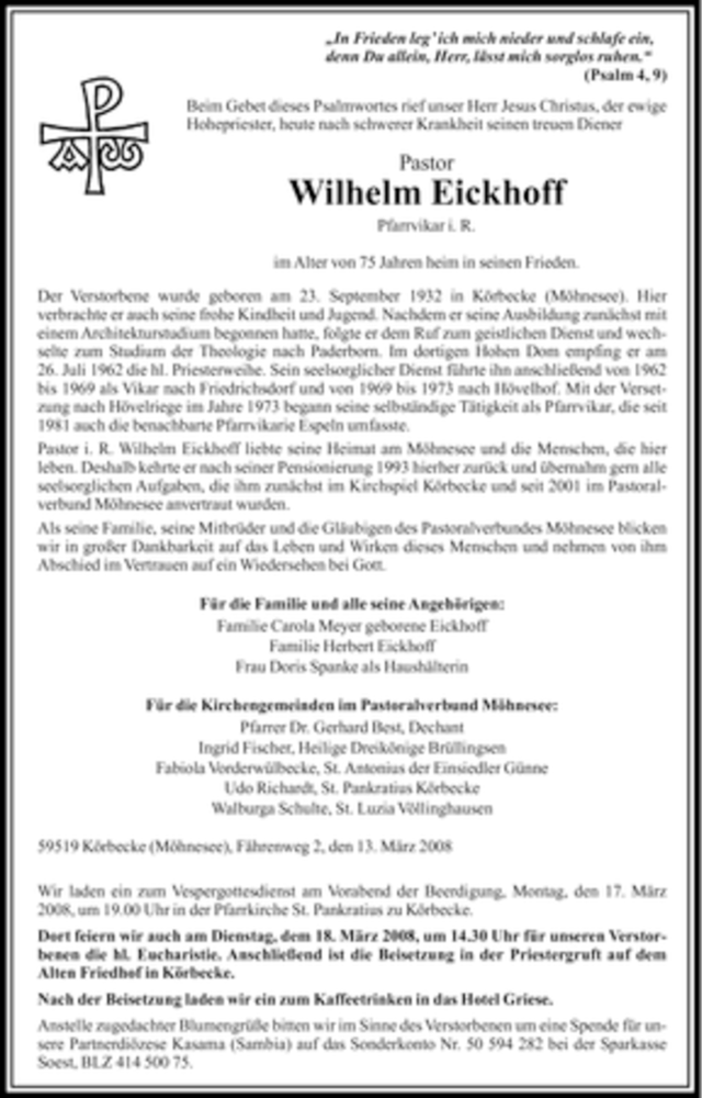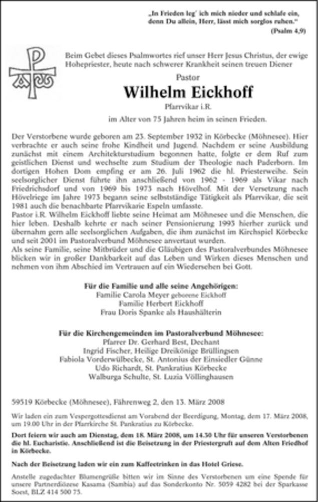 Hier finden Sie alle Traueranzeigen aus der Zeitung, die bisher für Wilhelm Eickhoff erschienen sind. Weitere Traueranzeigen, die in der Zeitung erscheinen, werden hier ebenfalls aufgelistet