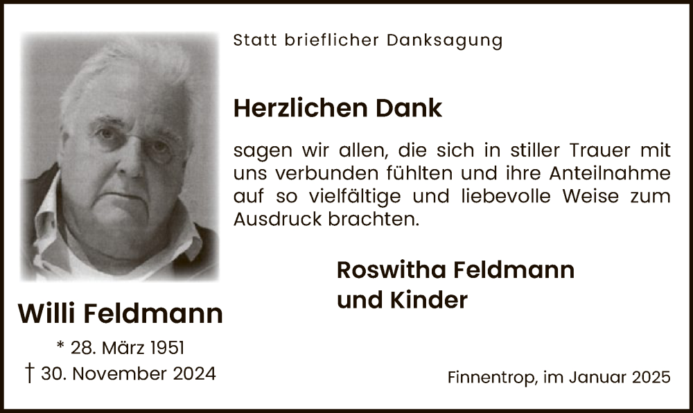 Hier finden Sie alle Traueranzeigen aus der Zeitung, die bisher für Willi Feldmann erschienen sind. Weitere Traueranzeigen, die in der Zeitung erscheinen, werden hier ebenfalls aufgelistet