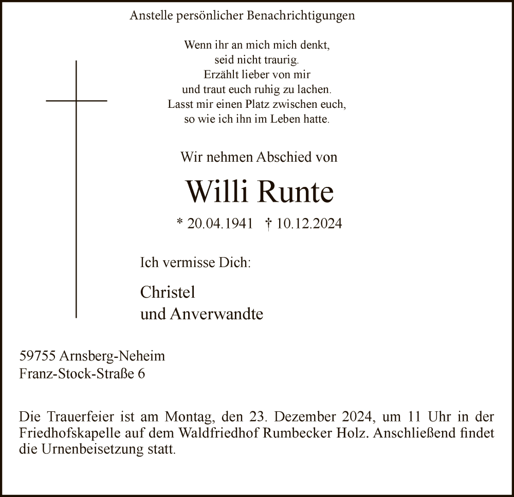 Hier finden Sie alle Traueranzeigen aus der Zeitung, die bisher für Willi Runte erschienen sind. Weitere Traueranzeigen, die in der Zeitung erscheinen, werden hier ebenfalls aufgelistet