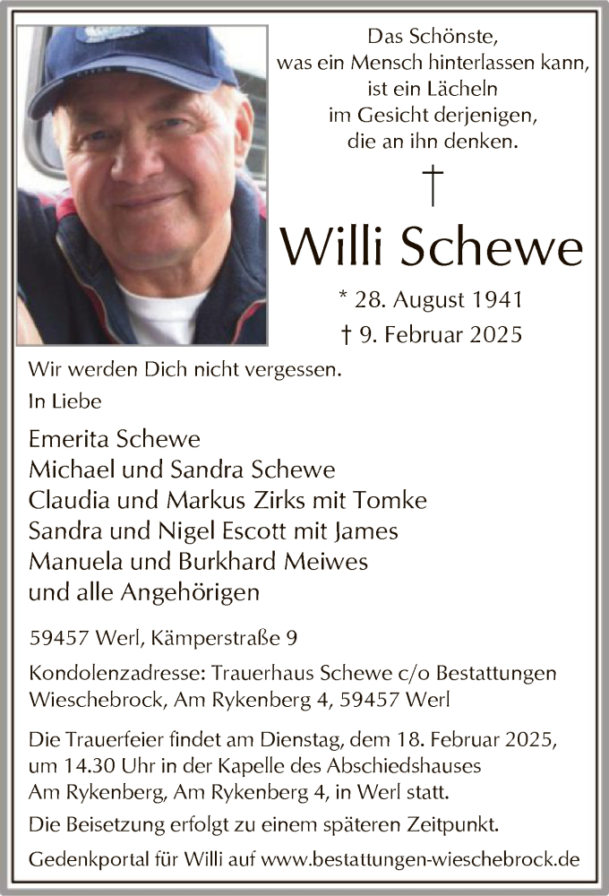 Hier finden Sie alle Traueranzeigen aus der Zeitung, die bisher für Willi Schewe erschienen sind. Weitere Traueranzeigen, die in der Zeitung erscheinen, werden hier ebenfalls aufgelistet