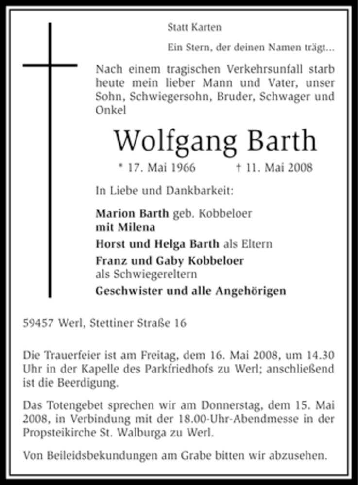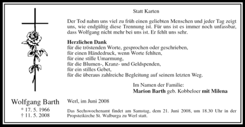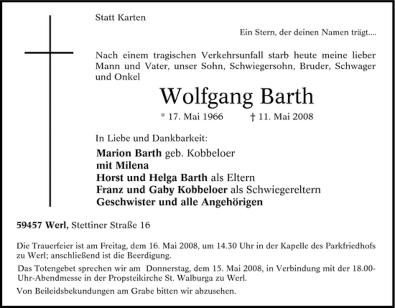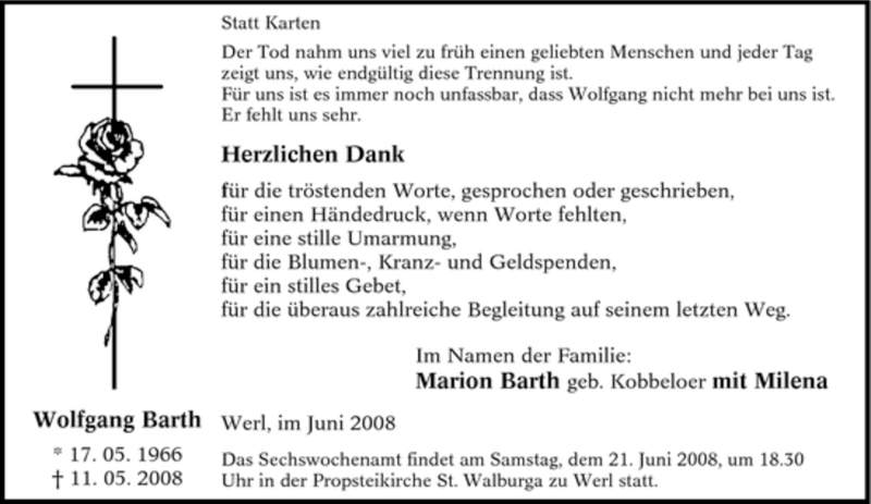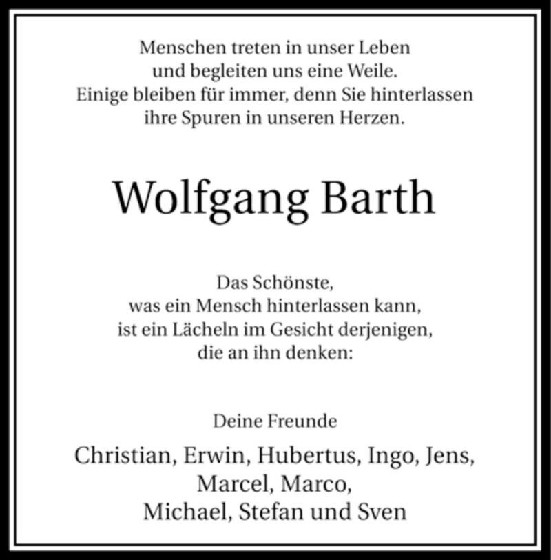 Hier finden Sie alle Traueranzeigen aus der Zeitung, die bisher für Wolfgang Barth erschienen sind. Weitere Traueranzeigen, die in der Zeitung erscheinen, werden hier ebenfalls aufgelistet