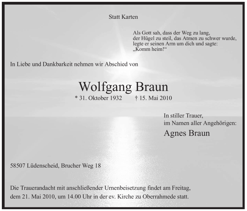 Hier finden Sie alle Traueranzeigen aus der Zeitung, die bisher für Wolfgang Braun erschienen sind. Weitere Traueranzeigen, die in der Zeitung erscheinen, werden hier ebenfalls aufgelistet