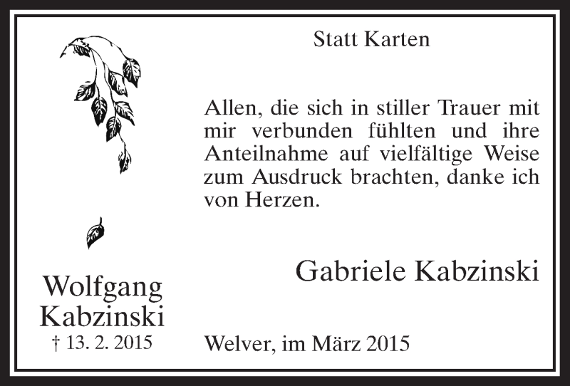 Hier finden Sie alle Traueranzeigen aus der Zeitung, die bisher für Wolfgang Kabzinski erschienen sind. Weitere Traueranzeigen, die in der Zeitung erscheinen, werden hier ebenfalls aufgelistet