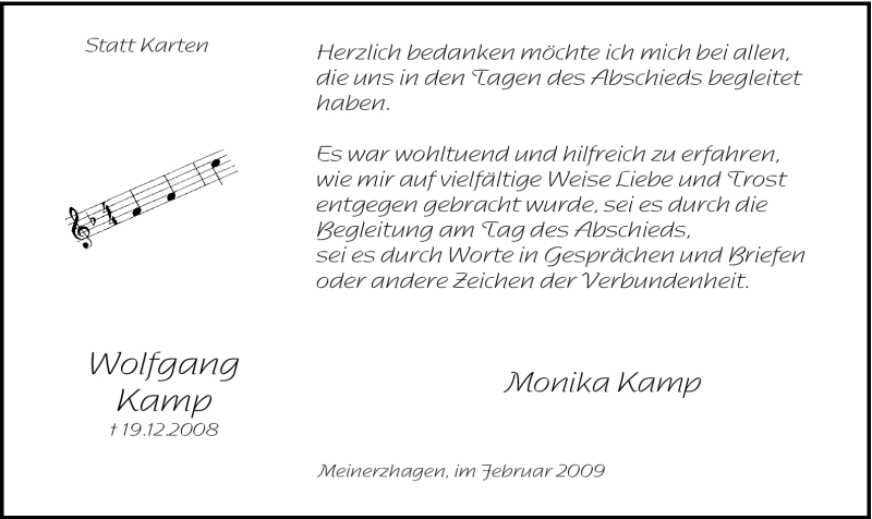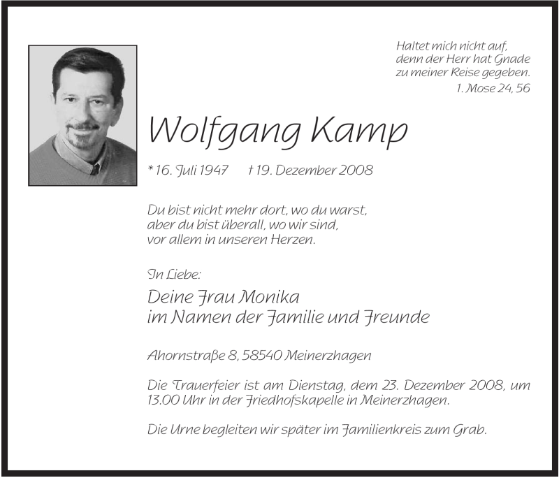 Hier finden Sie alle Traueranzeigen aus der Zeitung, die bisher für Wolfgang Kamp erschienen sind. Weitere Traueranzeigen, die in der Zeitung erscheinen, werden hier ebenfalls aufgelistet