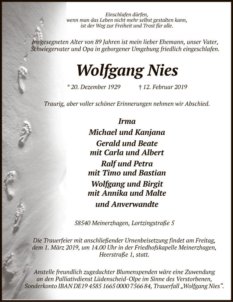 Hier finden Sie alle Traueranzeigen aus der Zeitung, die bisher für Wolfgang Nies erschienen sind. Weitere Traueranzeigen, die in der Zeitung erscheinen, werden hier ebenfalls aufgelistet